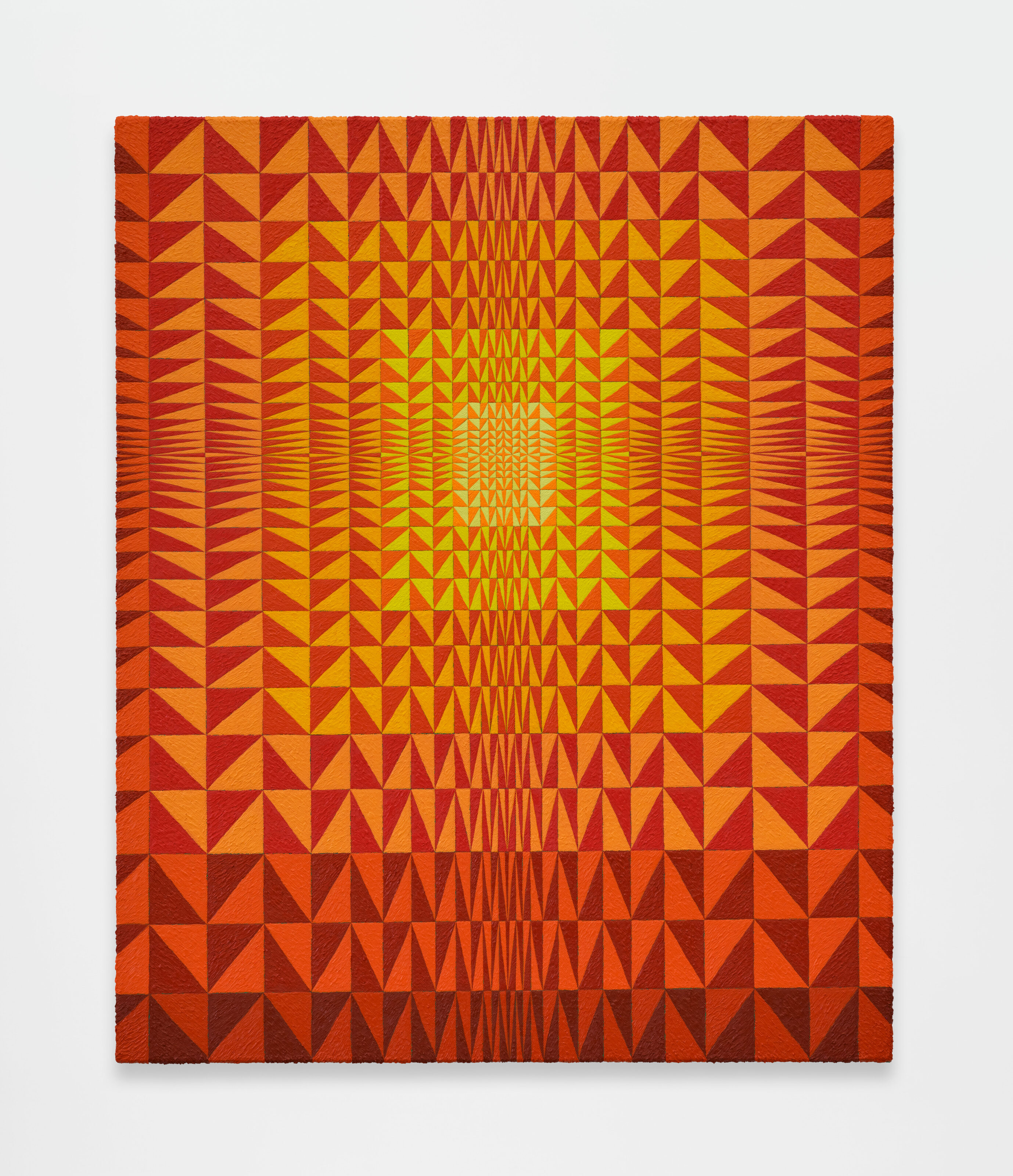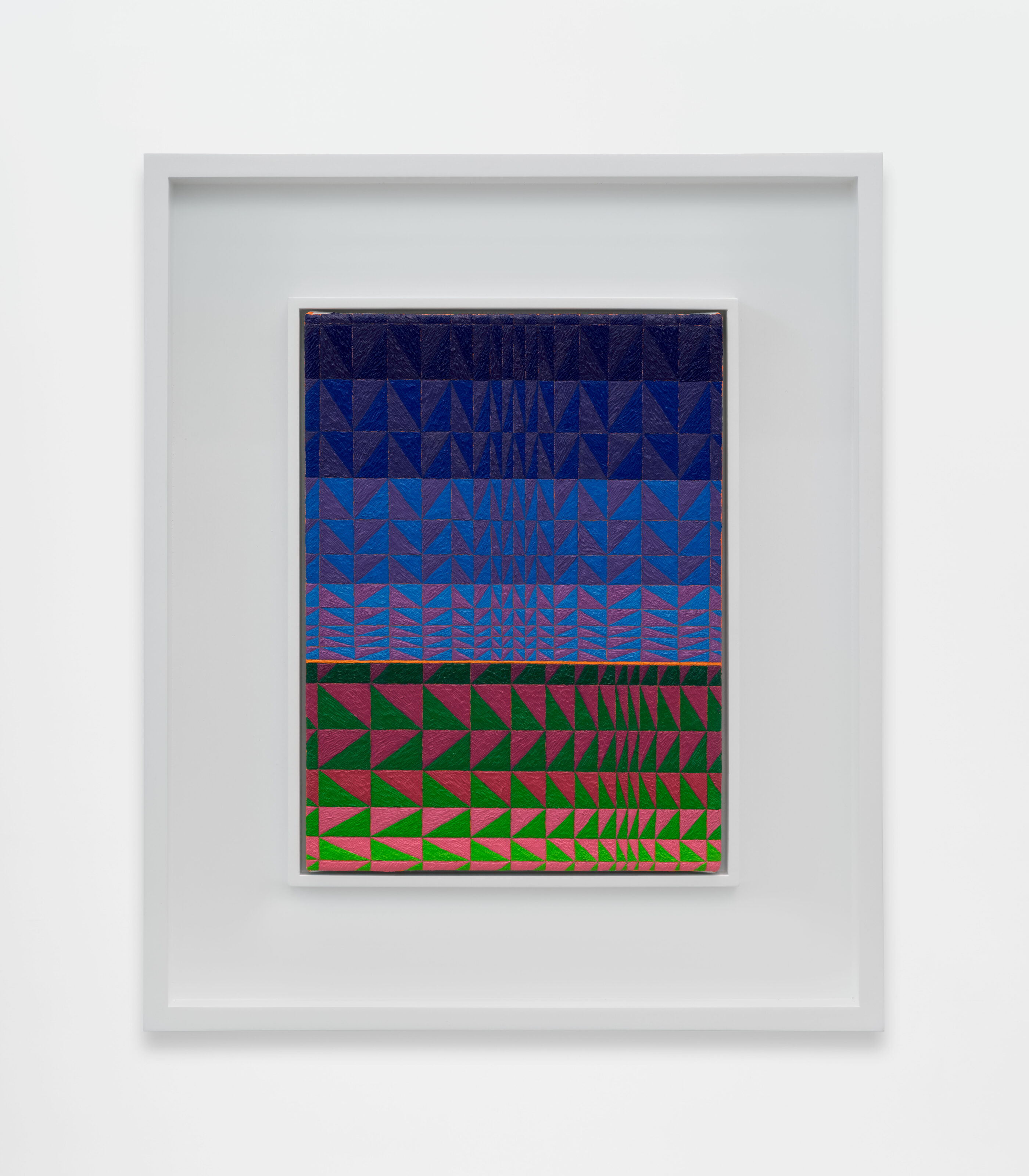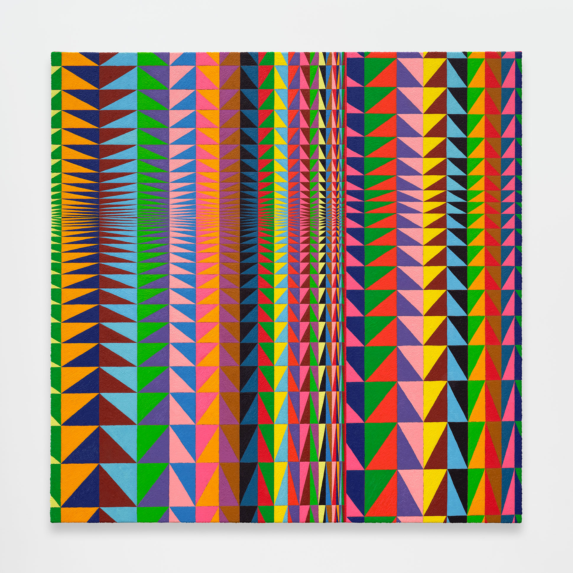 Soumahoro, on the other hand, was born in 1990 in Paris and has lived for about a decade in Los Angeles, where he began his self-taught painting practice. His work is rooted in a highly precise form of abstraction, composed of mathematically repeated triangles within a strict, pre-defined colored grid. While these two painters emerge from vastly different worlds, they share more common ground than one might initially think. Even before paint touches canvas, both artists engage in rigorous, methodical processes. Wuidar draws dozens of miniature geometric compositions in a sketchbook, each constrained within a small frame and filled with color. Out of hundreds of such studies, one will be chosen to be realized on a larger scale. Soumahoro, for his part, develops his compositions through a rationalized, near-ritualistic method: a quasi-algorithmic calculation determines the repetition of motifs, each color is assigned a number, each brush—never more than 5 millimeters wide—is chosen specifically for the painting at hand, and a piece of music is selected to accompany the entire creative process.