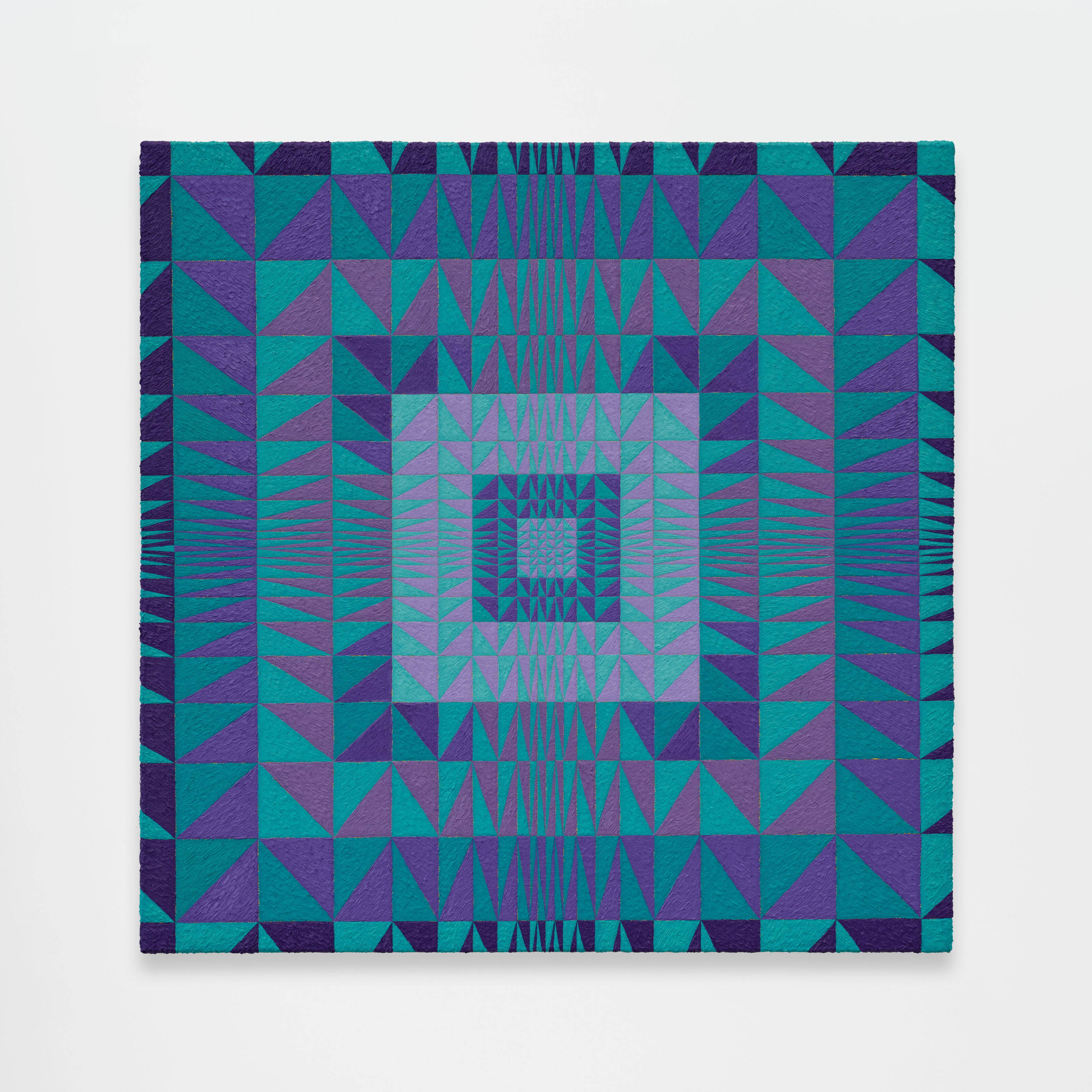 Paris-born, Los Angeles-based painter and visual artist Brooklin A. Soumahoro has a profound intuition for color and line. His work begins with humble painted underlayers, evolving through extraordinary technical precision and personal discipline. Soumahoro seamlessly fuses precise geometric patterns with vibrant, energetic color fields, creating layered, transportive surfaces that act as visual thresholds. Rooted in his multicultural upbringing and diverse interests, Soumahoro’s creative process draws inspiration from unexpected and eclectic sources. Music, sound, and ideas of sonic frequency resonate as strongly in his imagination as traditions of patterning, global art histories, and broader cultural touchstones. Synthesizing these influences through rigorous color theory research and meticulous formal approaches, Soumahoro creates images that are contemplative and portal-like, inviting viewers to journey beyond the surface.